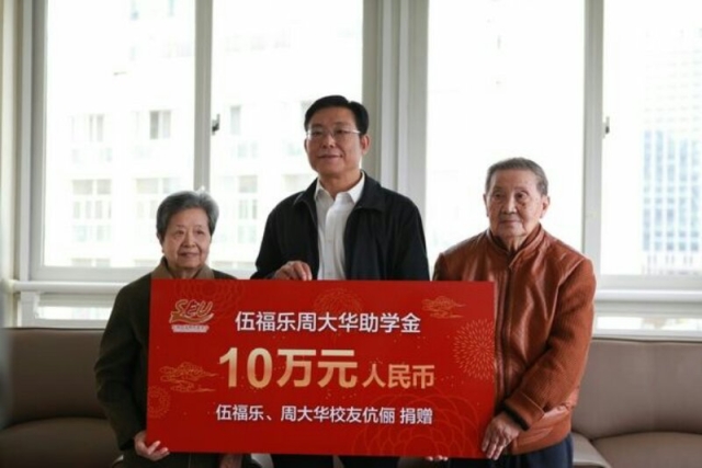 重阳节期间,现年92岁的我校校友、退休老教师伍福乐,与其夫人、现年88岁的周大华老人共同捐款10万元,在我校设立伍福乐周大华助学金,为母校教育事业的发展贡献一片爱心。