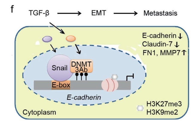在本文中,研究者通过对胃癌组织样本,体、内外功能实验的分析,发现DNMT3A的异构体isoform b (DNMT3Ab)可以促进胃癌细胞的迁移和侵袭能力,诱导胃癌细胞上皮-间质转化(EMT)的发生,提示DNMT3Ab对胃癌的转移起到重要调控作用。进一步机制研究发现,DNMT3Ab能够协同组蛋白甲基转移酶形成复合物影响H3K27me3和H3K9me2水平,进而对肿瘤细胞转移关键基因E-cadherin启动子区进行表遗传调控,抑制E-cadherin的表达,并且这一过程依赖于转录因子Snail的招募。该项研究加深了对DNMT3A及其异构体在胃癌发生发展中作用的新认识,首次揭示了DNMT3Ab-Snail-E-cadheirn信号轴对胃癌转移调控的表遗传机制,这一发现可能为伴随DNMT3Ab高表达的转移性胃癌提供新的治疗策略,为临床DNA甲基化药物的研发提供新的靶点。